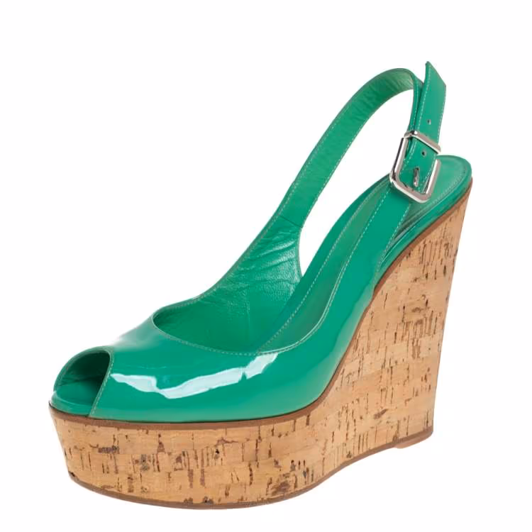 مملوكة مسبقًا صندل جيانفيتور روسى فتحة كعب نعل سميك كعب روكى فيلين جلد لامع أخضر مقاس 37