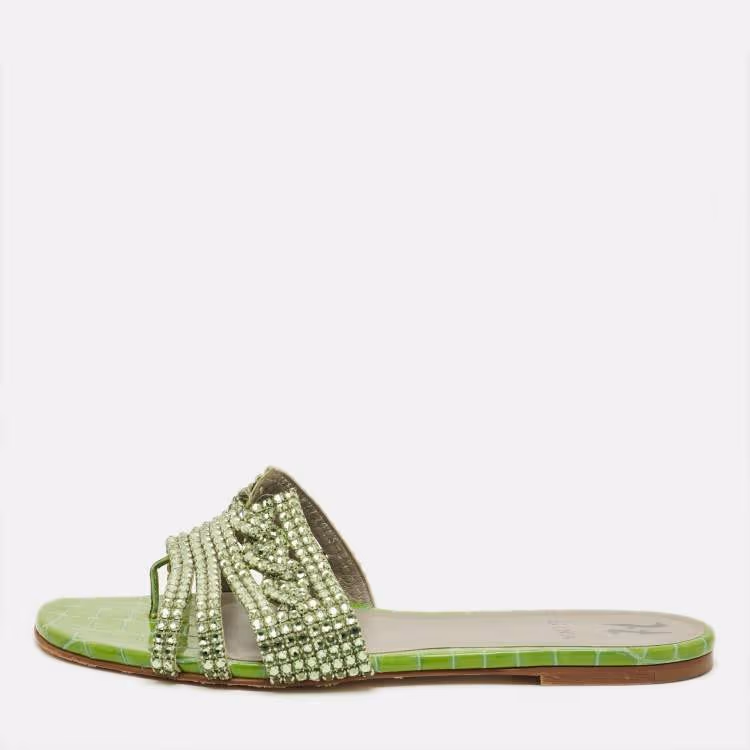 صندل سلايد جينا لورين جلد لامع بنقشة التمساح أخضر مزخرف كريستال مقاس 39