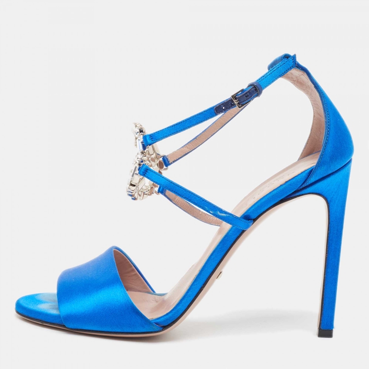 مملوكة مس�بقًا Gucci Blue Satin Crystal Embellished Interlocking G Ankle Strap Sandals Size 38