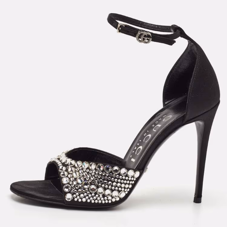 مملوكة مسبقًا صندل سيور كاحل مزين بالكريستال من الستان الأسود من غوتشي مقاس 37