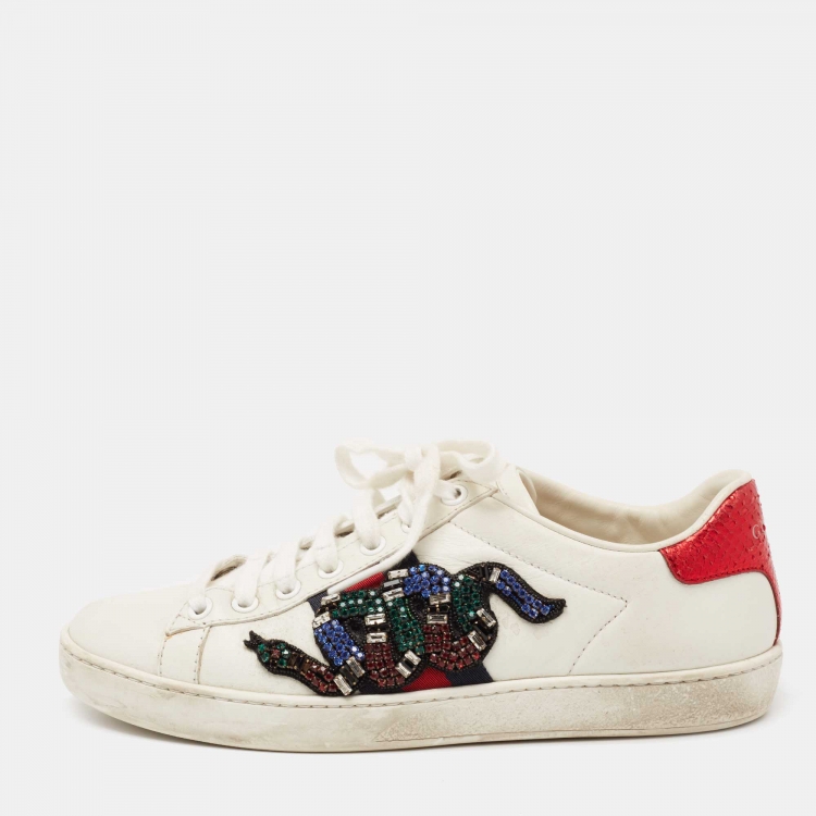 مملوكة مسبقًا حذاء رياضي غوتشي أيس ثعبان مزخرف جلد أبيض عنق منخفض مقاس 37