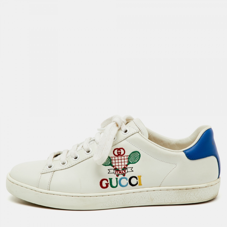 حذاء رياضي غوتشي جلد أبيض/أزرق مطرز للتنس منخفظ من أعلى مقاس 37.5