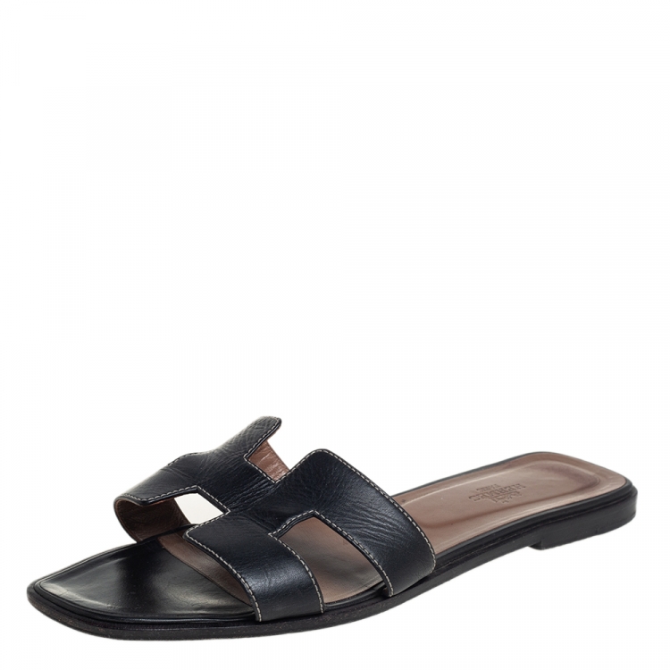 مملوكة مسبقًا حذاء سلايدز فلات هيرمس أوران جلد أسود مقاس 41