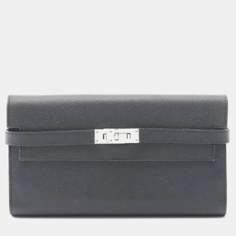 Pre Owned Hermes Kelly Wallet Long Verso Bifold Leather Calfskin Epsom Navy