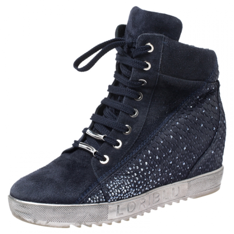 حذاء رياضي لوريبلو سويدي وجلد نقشة الثعبان مزخرف كريسال أزرق رقبة مرتفعة مقاس 38.5