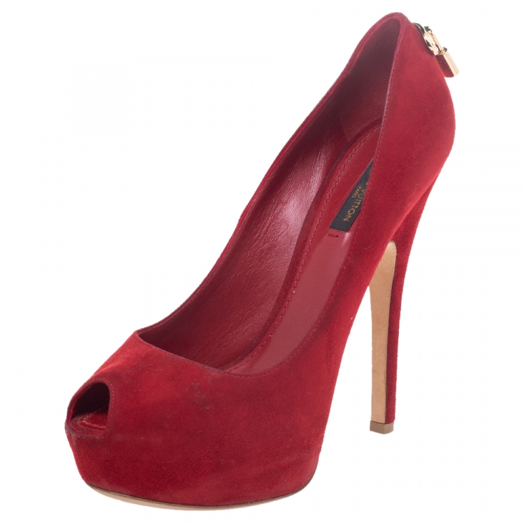 Pre Owned حذاء كعب عالي لوي فيتون أوه ريلي سويدي أحمر نعل سميك مقدمة مفتوحة مقاس 38