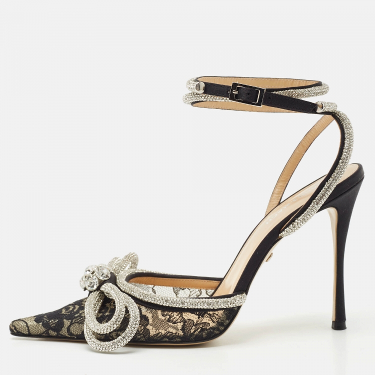 Pre Owned حذاء كعب عالي ماك أند ماك ساتان أسود مزدوج الفيونكة مزين بالكريستال بحزام الكاحل مقاس 39