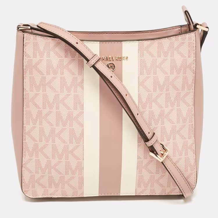 Michael Kors Pink Center Stripe Gloria Signature Coated Canvas and Leather Crossbody Bag
