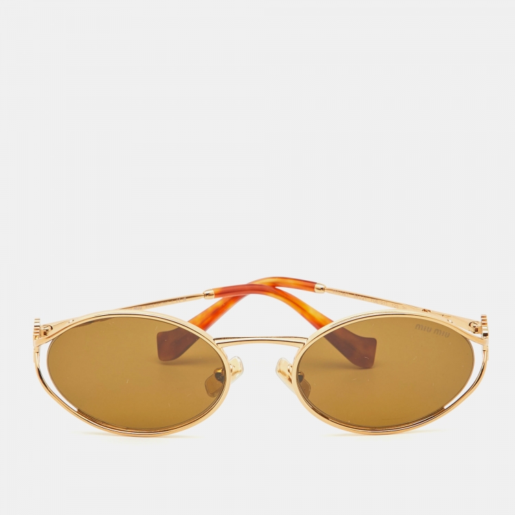 Pre Owned Miu Miu Gold Tone/Brown SMU52Y Logo Oval Sunglasses