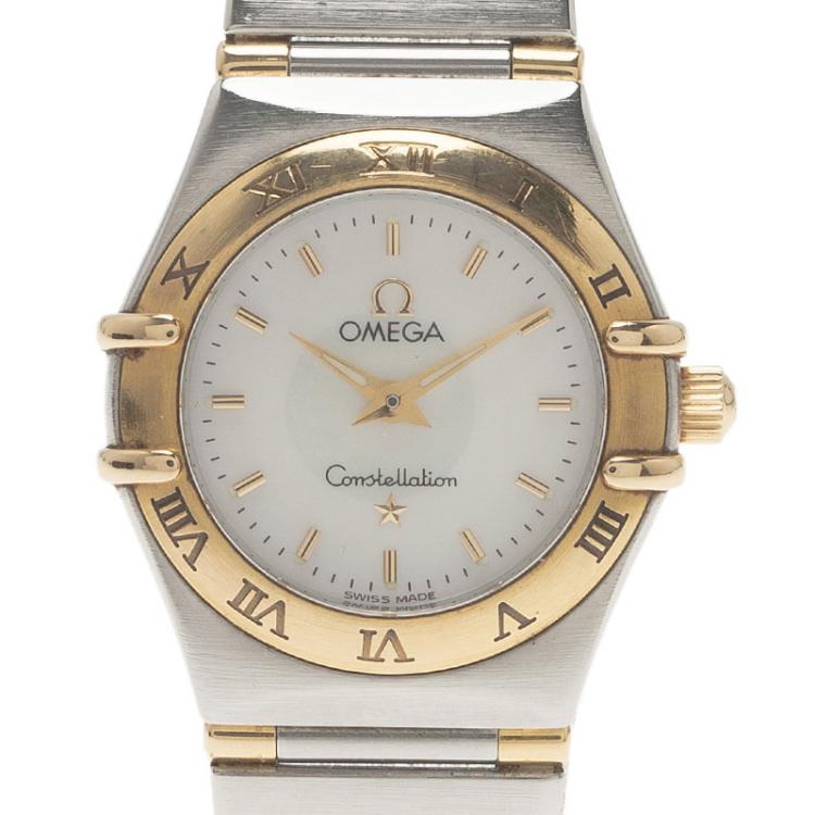 ساعة يد نسائية أوميغا كونستلايشن ستينلس ستيل وذهب أصفر عيار 18 وعرق لؤلؤ 22 مم