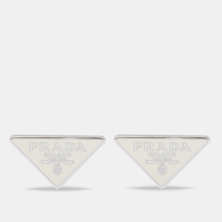 مملوكة مسبقًا Prada Silver Logo Enamel Triangle Symbole Stud Earrings