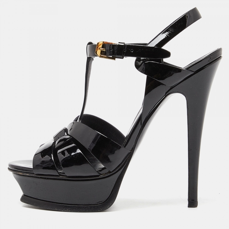 Saint Laurent Black Patent Leather Tribute Ankle Strap Sandals Size 37