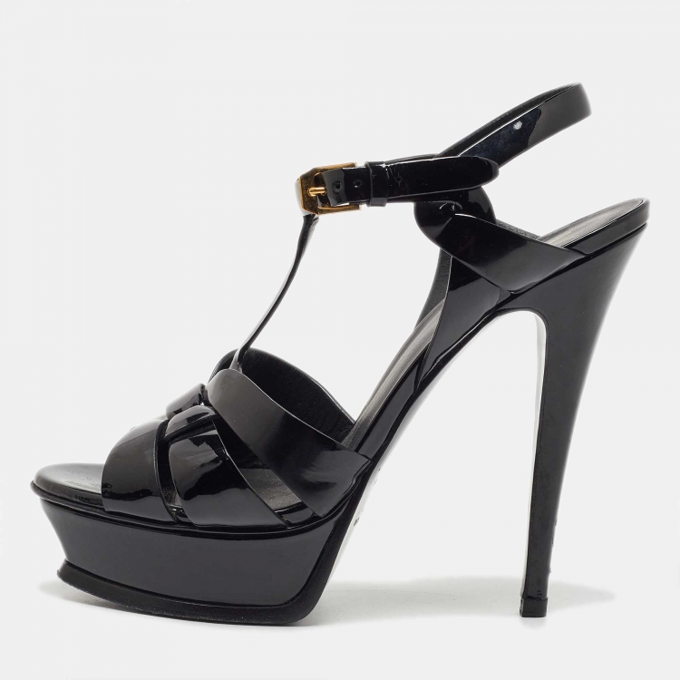 Saint Laurent Black Patent Leather Tribute Ankle Strap Sandals Size 37.5