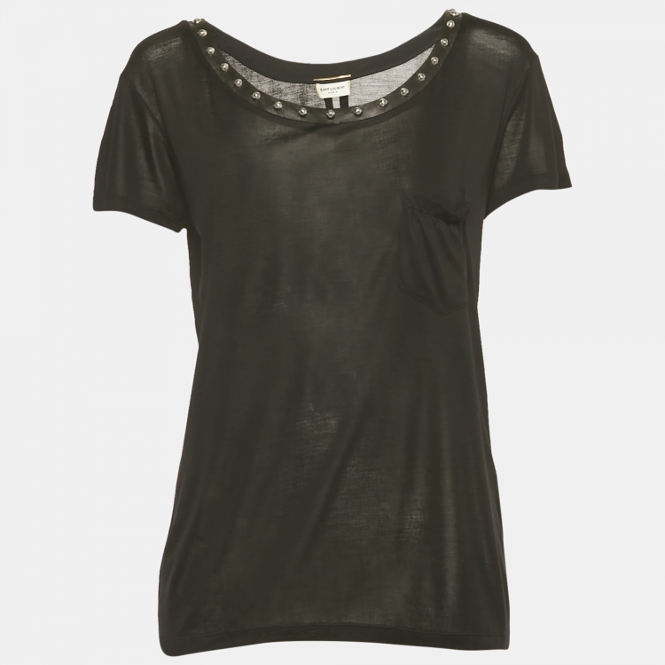 مملوكة مسبقًا تي شيرت سان لوران باريس حرير أسود بترصيعات صغيرة