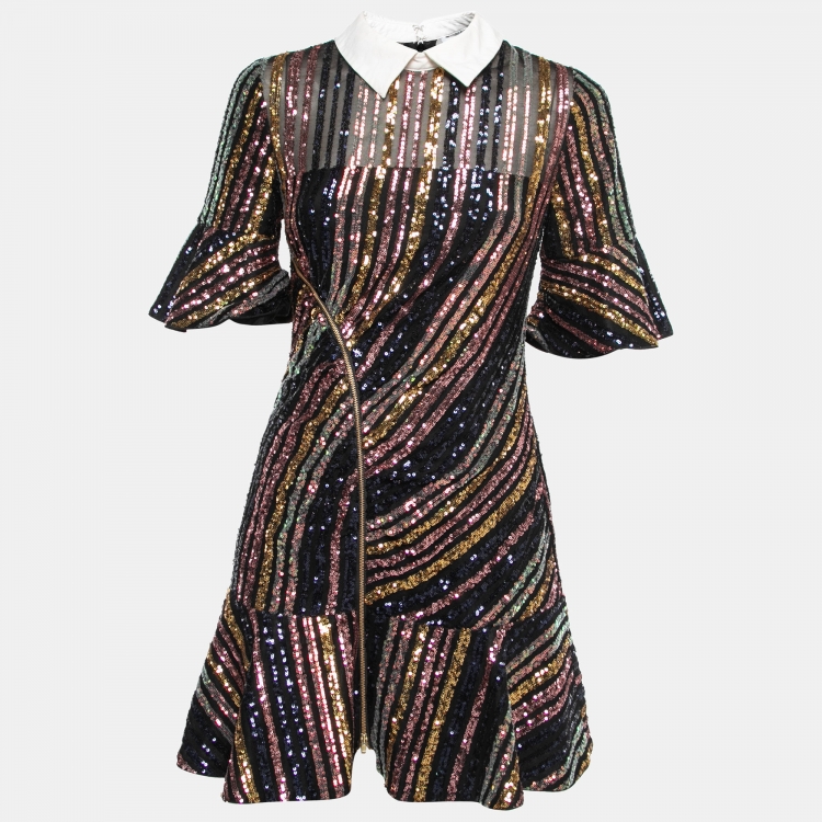 Self-Portrait Multicolor Sequin-Embellished Collared Mini Dress M