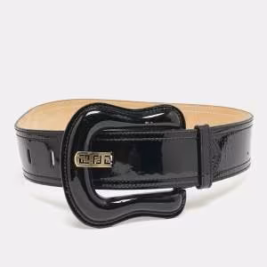 حزام فندي جلد لامع أسود بإبزيم B على الخصر 80 سم