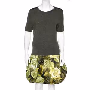 فستان ميني موسكينو كوتور صوف أخضر تريكو مورد مطبوع بحافة مكشكشة مقاس كبير - لارج