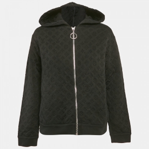 جاكيت بقلنسوة بسحّاب خليط حرير بطبعة شعار رمادي لوي فيتون مقاس صغير