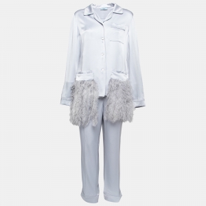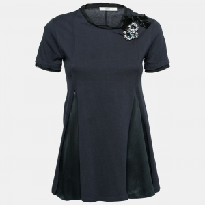 فستان سهرة برادا حرير وصوف أزرق مزخرف لؤلؤ بأكمام قصيرة مقاس وسط ( ميديوم )