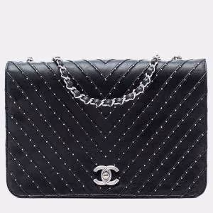 حقيبة شانيل كلاسيك ناعمة (جلد حمل) سوداء كبيرة مع فلاب مزدوجة بالتشكيل الهندسي