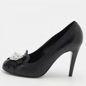 حذاء كعب عالي شانيل جلد أبيض/أسود مزين زهرة كاميليا وسي سي مقاس 38