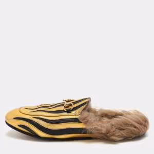 حذاء مولز غوتشي برينستون مبطن بالفرو جلد ذهبي/أسود هورسبت مقاس 38