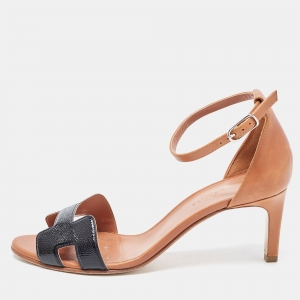 حذاء سلايد فلات هيرمس أوز جلد ودنيم أزرق كحلي/بني فاتح مقاس 37
