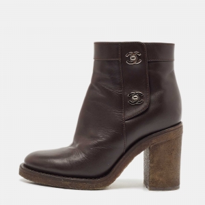 حذاء بوت كاحل شانيل نعل سميك غطاء مقدمة جلد وسويدي بني مقاس 38