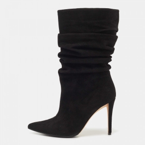 حذاء بوت منتصف الساق جينا ساتان أسود مزين بالكريستال مطوي مقاس 37