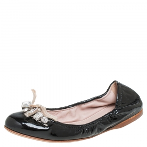 حذاء فلات باليرينا ميو ميو فيونكة مزخرف كريستال جلد لامع أسود مقاس 36.5