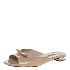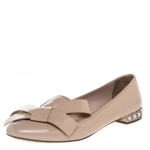 حذاء باليرينا فلات ميو ميو جلد لامع بيج مزين فيونكة مزخرفة كريستال مقاس 40