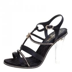 صندل شانيل لوسيت ساتان أسود بسيور مزخرفة بكريستالات CC مقاس 41