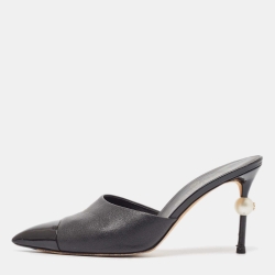 صندل شانيل جلد أسود لامع حزام حرف T كعب مزخرف باللآلئ مقاس 37.5