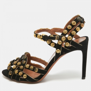 صندل سالفاتوري فيراغامو ساتان أسود كعب مزخرف كريستال بحزام للكاحل مقاس 35.5