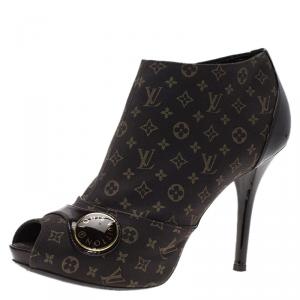 حذاء كعب عالي لوي فيتون بمقدمة مفتوحة مزينة بنرد و بنعل سميك جلد لامع بني داكن مقاس 36
