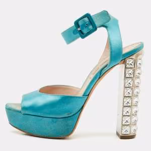 حذاء كعب عالي ميو ميو جلد نقشة الثعبان أزرق مقدمة مفتوحة نعل سميك مقاس 37.5