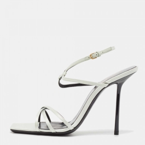 صندل سان لوران باريس تريبوت سير كاحل جلد تمساح بارز فضي ميتاليك مقاس 39