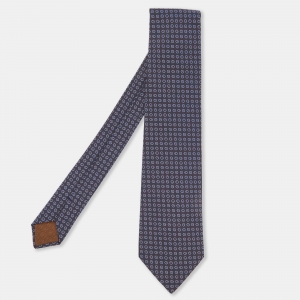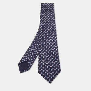 Hermès Navy Blue Job Interview Printed Silk Slim Tie
