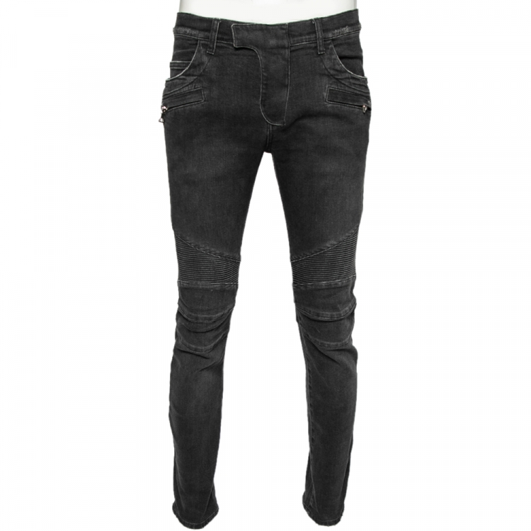 Balmain Charcoal Grey Denim Quilted Detail Biker Jeans M