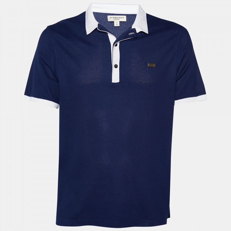 Burberry Navy Blue Cotton Pique Contrast Detail Polo T-Shirt L
