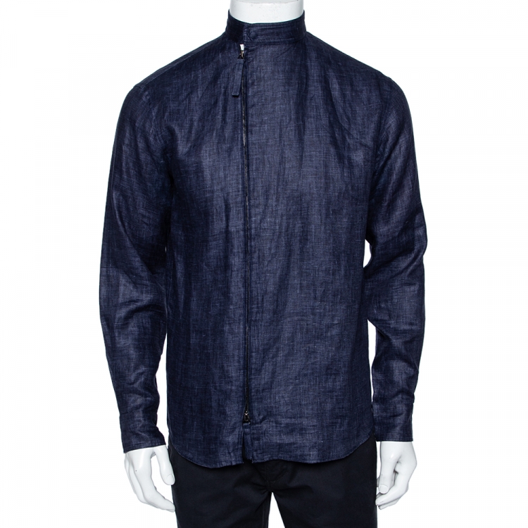Pre Owned Giorgio Armani Navy Blue Linen Stand Collar Zipper Front Shirt M