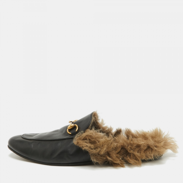 Gucci Princetown Black Leather and Fur Mules Size 44.5
