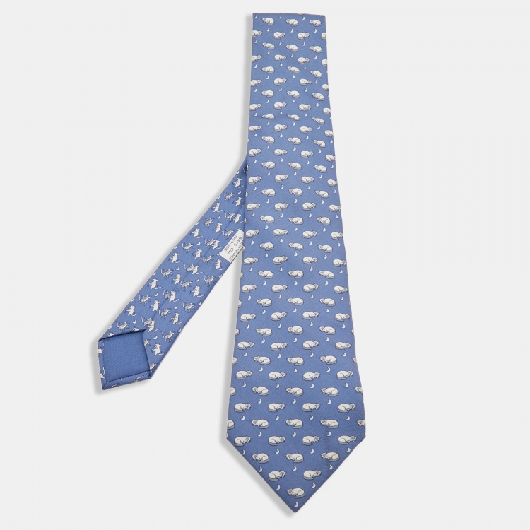 Pre Owned Hermes Blue Cat & Mice Print Silk Tie
