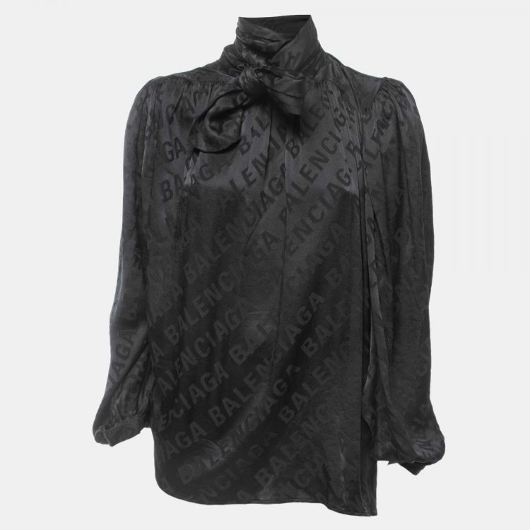 Pre Owned Balenciaga Black Logo Patterned Silk Button Front Neck Tie Detail Oversized Blouse M