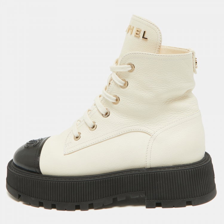 Chanel Black/Cream Leather CC Cap Toe Logo Combat Boots Size 38.5