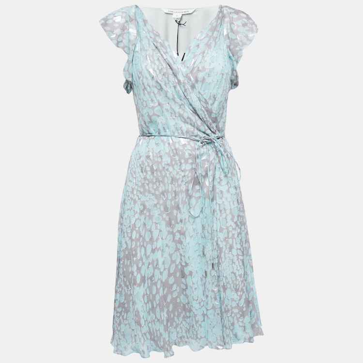 Pre Owned Diane Von Furstenberg Grey/blue Leopard Rain Spots Printed Silk Delancey Short Wrap Dress L
