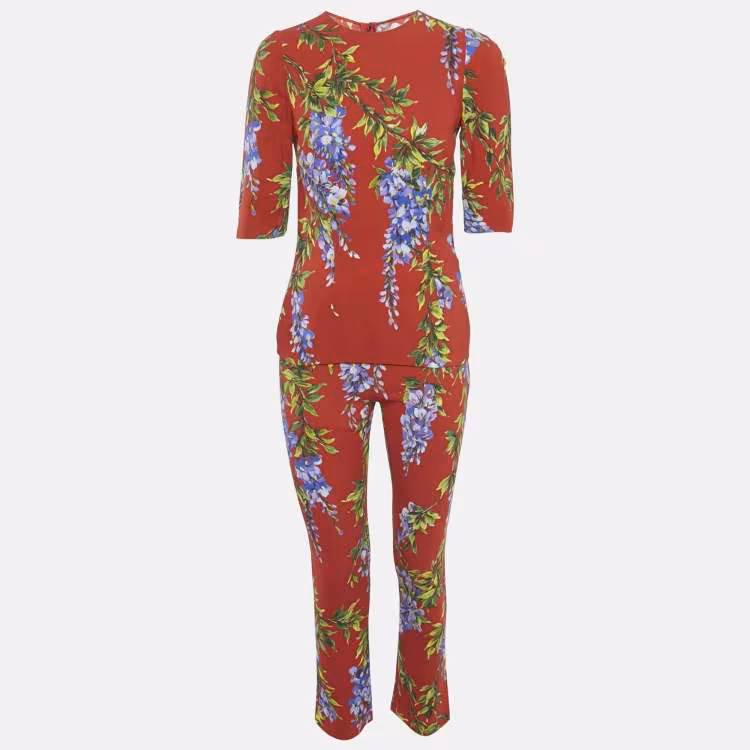 Pre Owned Dolce & Gabbana Red Floral Print Crepe Top and Pants Set S
