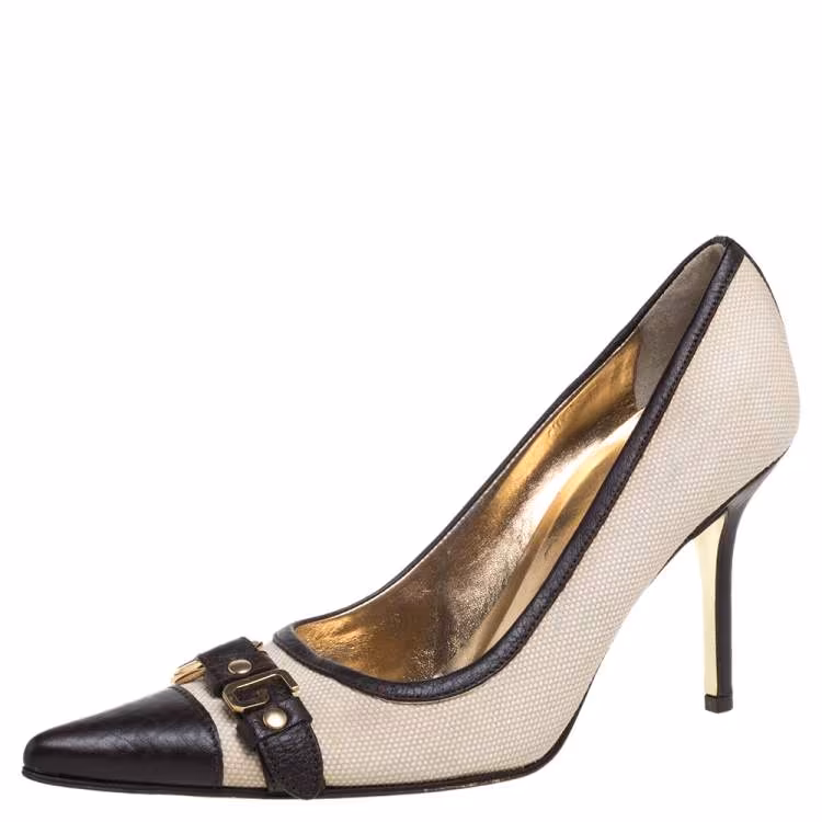 Dolce & Gabbana Vintage Beige/Brown Canvas And Leather Logo Embellished Cap Toe Pumps Size 38