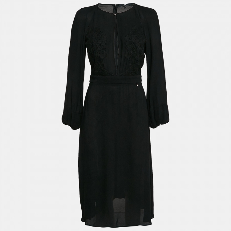 Elisabetta Franchi Black Lace Trim Crepe Plunging Neck Midi Dress M