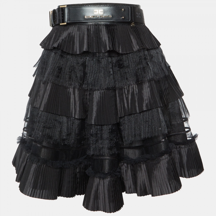 Elisabetta Franchi Black Pleated Crepe Belted Mini Skirt M